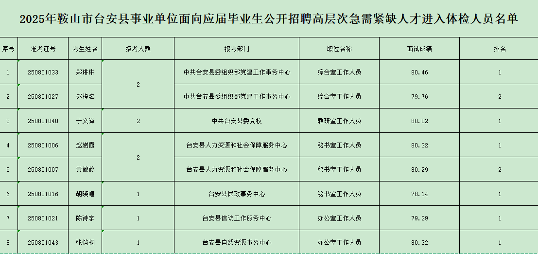 2025年鞍山市台安县事业单位面向应届毕业生公开招聘高层次急需紧缺人才面试环节已结束。根据《关于2025年鞍山市台安县事业单位面向应届毕业生公开招聘高层次急需紧缺人才公告》,经面试共有8名应聘人员进入体检环节,现将体检事宜公告如下: