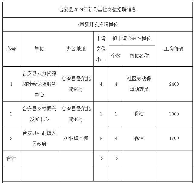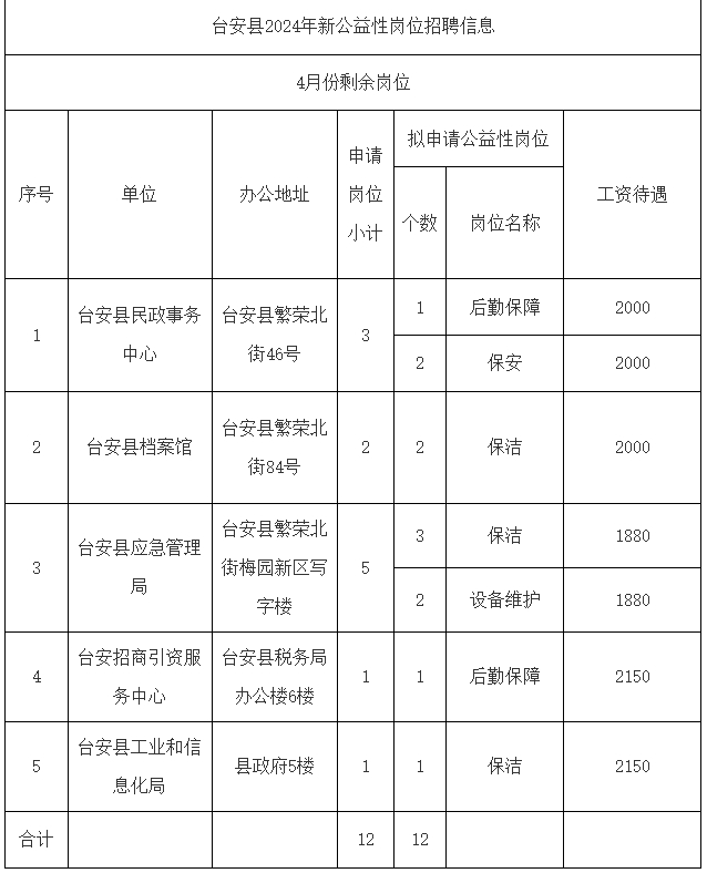 根据《台安县新开发全日制公益性岗位管理实施意见》精神,经请示县政府同意,现将县公益性岗位开发领导小组审核后的3家用人单位招聘的13个岗位和4月份剩余的12个岗位信息公告如下。(见附表)