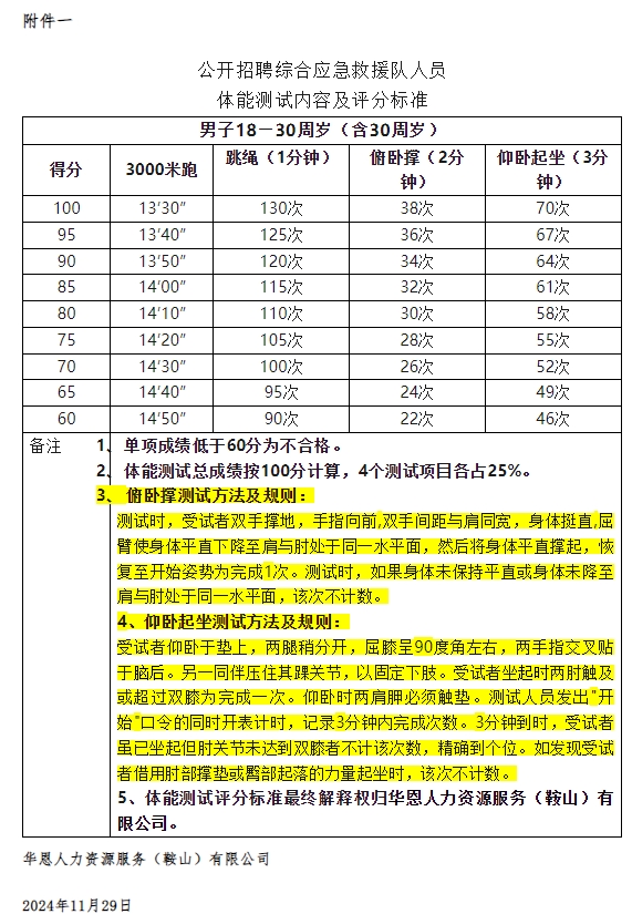 报考综合应急救援人员必须参加体能测试,体能测试项目设为3000米、跳绳、仰卧起坐、俯卧撑,具体评分标准见附件一。