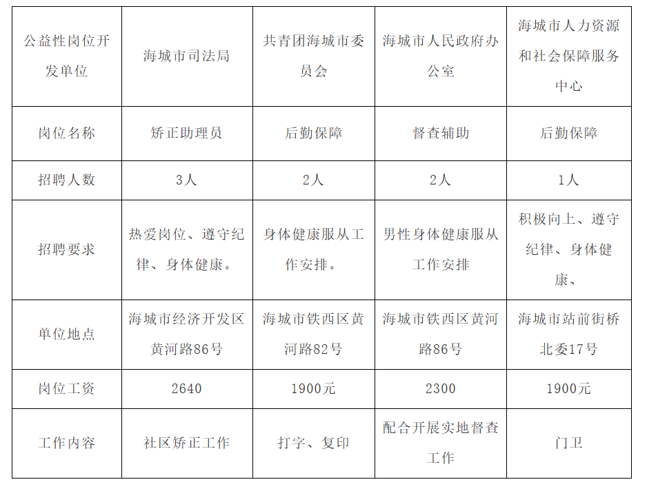 根据鞍人社发【2024】20号关于修订《鞍山市公益性岗位管理办法》的通知有关规定,结合用人单位岗位开发情况,经海城市公益性岗位开发审核领导小组审核同意,海城市司法局等四家拟聘用公益性岗位人员共计8人,具体事宜如下: