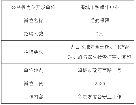 根据鞍人社发【2024】20号文件关于修订《鞍山市公益性岗位管理办法》的通知有关规定,结合用人单位岗位开发情况,经海城市公益性岗位开发审核领导小组审核同意,海城市融媒体中心拟聘用公益性岗位人员共计2人,具体事宜如下: