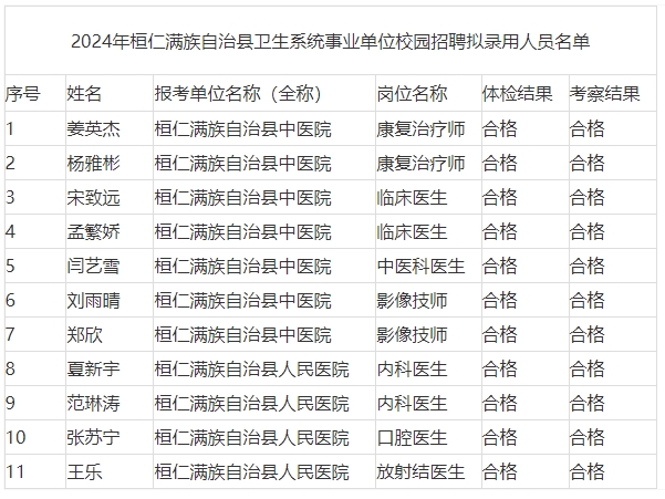 根据《2024年辽宁省桓仁满族自治县面向普通高校应届毕业生公开招聘医学人才实施方案》要求,经过报名、笔试、面试、体检、考察等程序,11名考生符合招聘条件,拟办理聘用备案手续,现公告如下:
