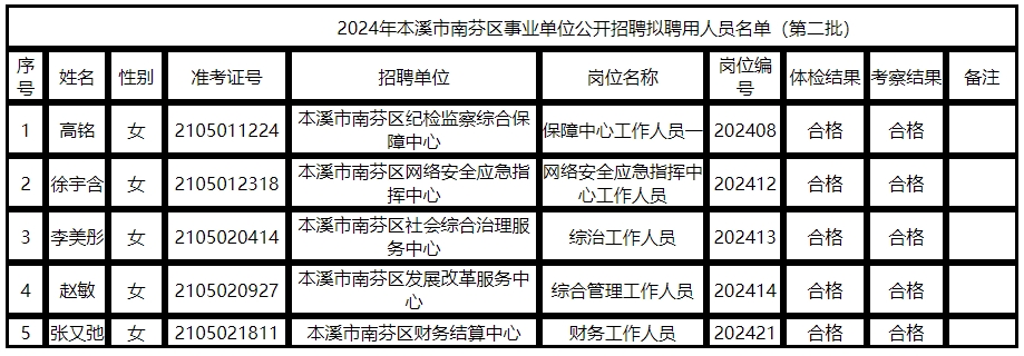 2024年本溪市南芬区事业单位公开招聘工作经报名、资格审查、笔试、资格复审、面试、体检、考察等环节,共有第二批5名同志被确定为拟聘用人员,现将名单予以公示。