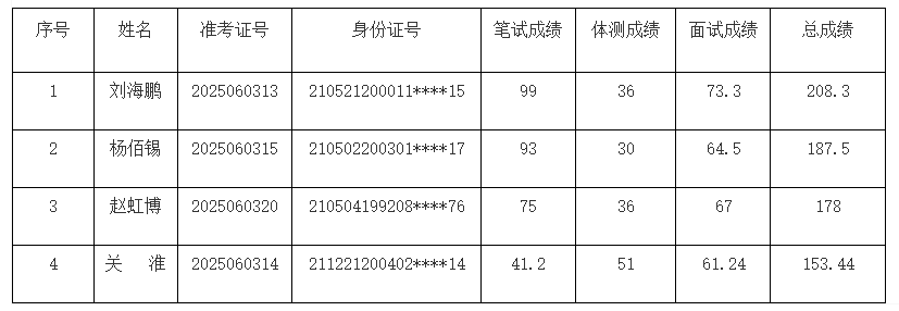 按照《本溪市平山区应急管理局面向社会公开招聘应急救援专业处置队员的公告》及相关工作安排,现对经笔试、体能测试、面试、体检程序均合格者,确定为拟聘用人选面向社会公示,公示期为5个工作日,从2025年7月9日起至7月15日。公示期间,社会公众对成绩有异议的,可以通过电话、信件等方式向招聘单位反映。举报要有事实依据和证据材料,署真实姓名,并留下联系方式。