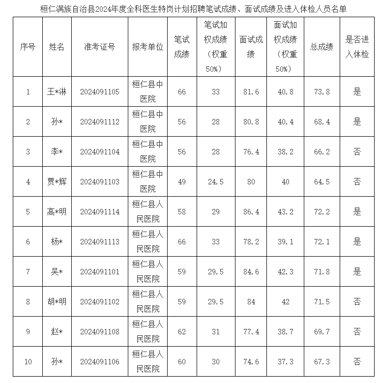 附件1:桓仁满族自治县2024年度全科医生特岗计划招聘笔试成绩、面试成绩及进入体检人员名单
