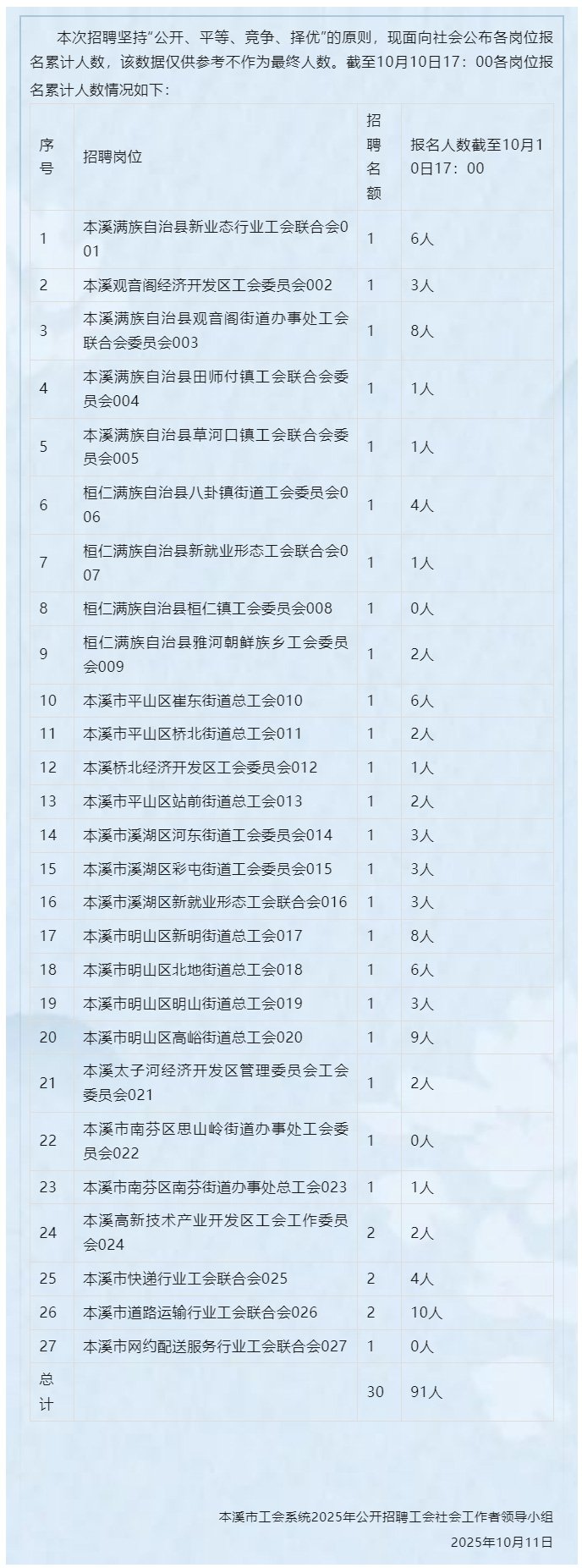 本溪市工会系统2025年公开招聘工会社会工作者岗位报名人数统计