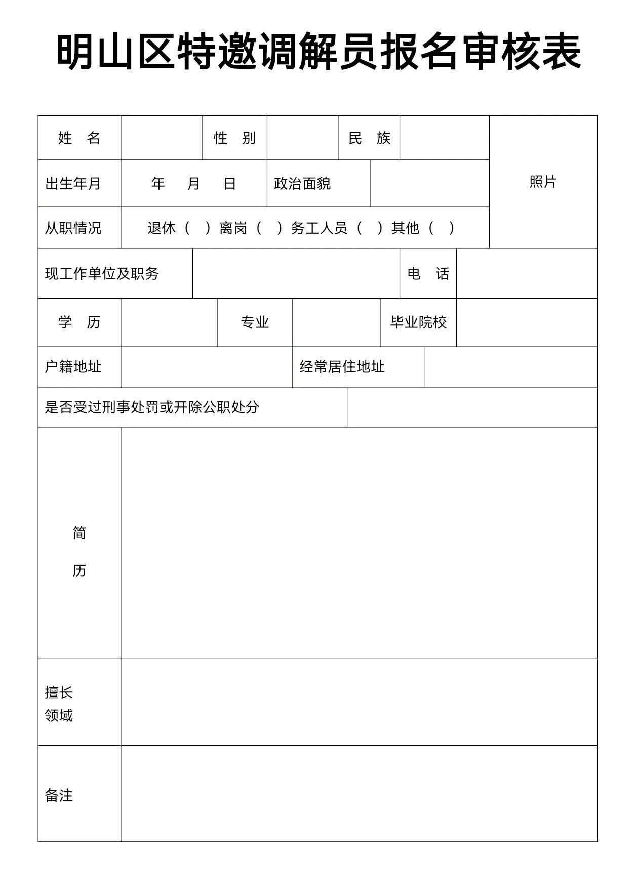 (二)报名方式:采取邮寄个人资料的方式(邮寄材料接收时间从报名时起至2025年12月30日止,以当地邮戳为准)。报名人员须填写《明山区特邀调解员报名审核表》,写明自己擅长的领域,并附上近期1寸免冠照片1张。同时提供身份证、学历证书及职业资格证明复印件等相关材料。