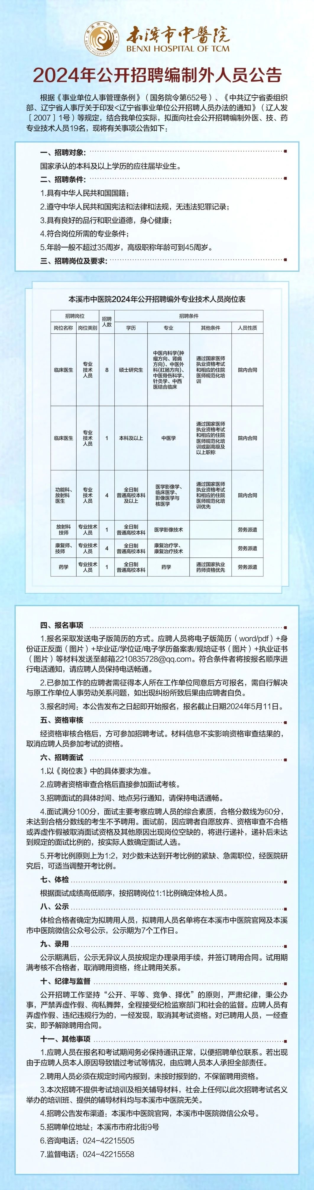 本溪市中医院2024年公开招聘编制外人员19人公告