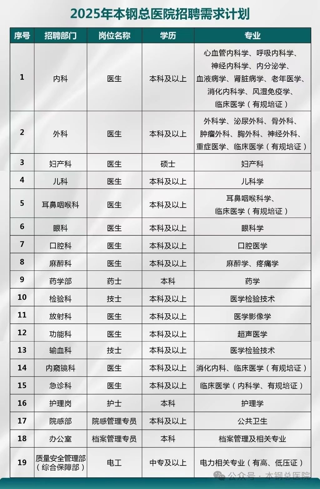 须持有岗位要求的规培证、执业资格证等。医疗岗位男性年龄在40周岁以下,女性年龄在35周岁以下,具有副主任医师及以上资格者年龄可适当放宽;其他岗位年龄在35周岁以下。