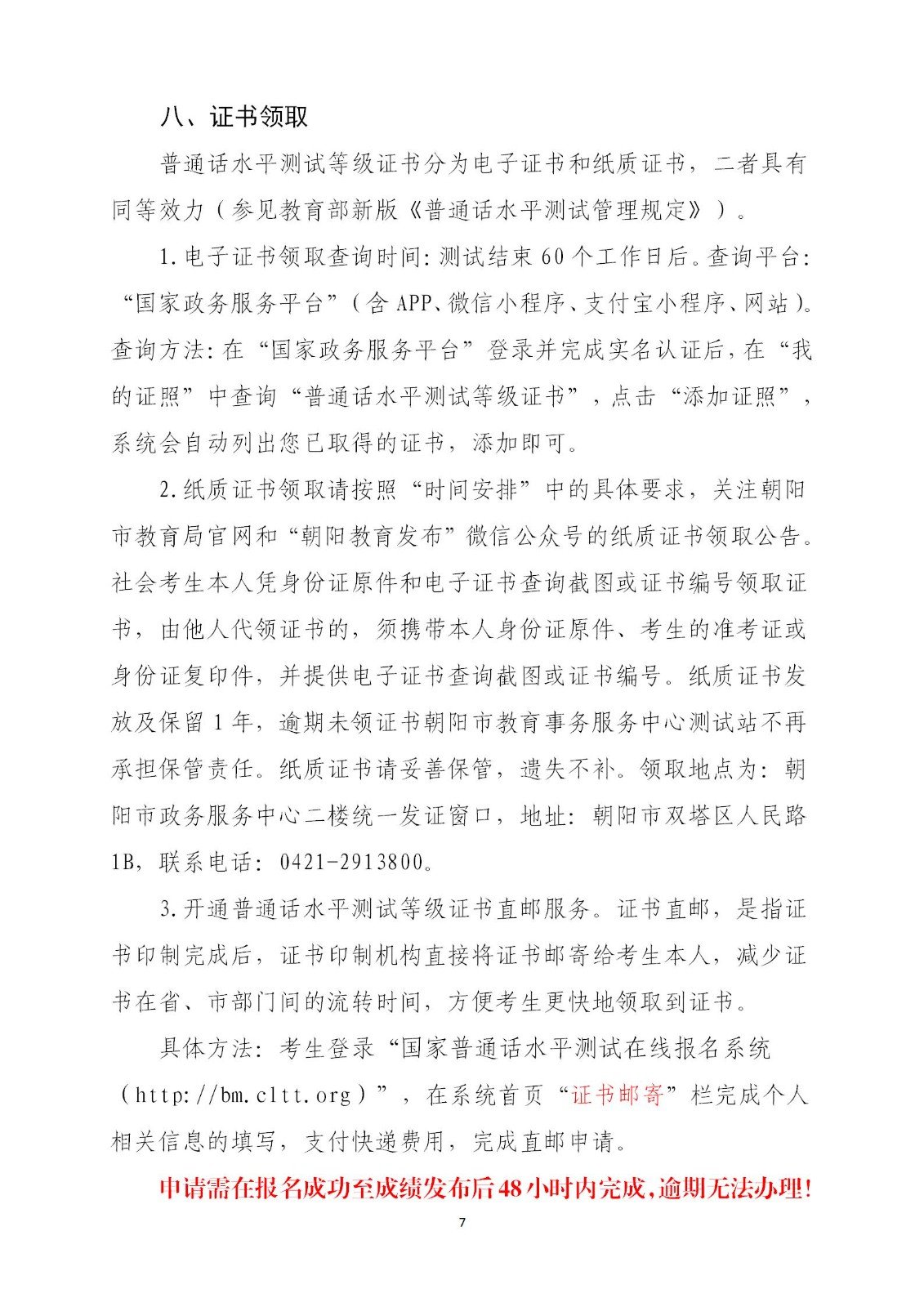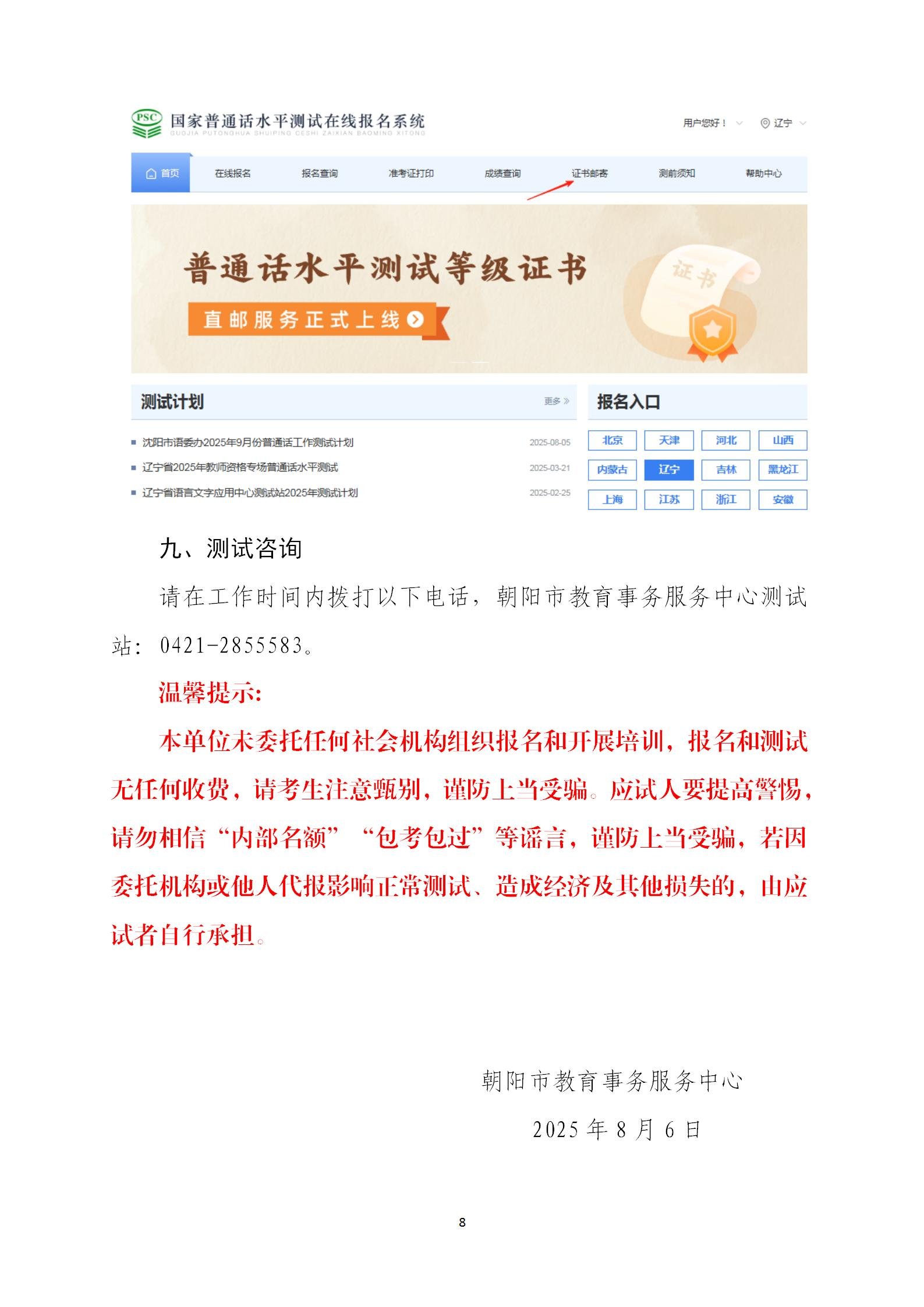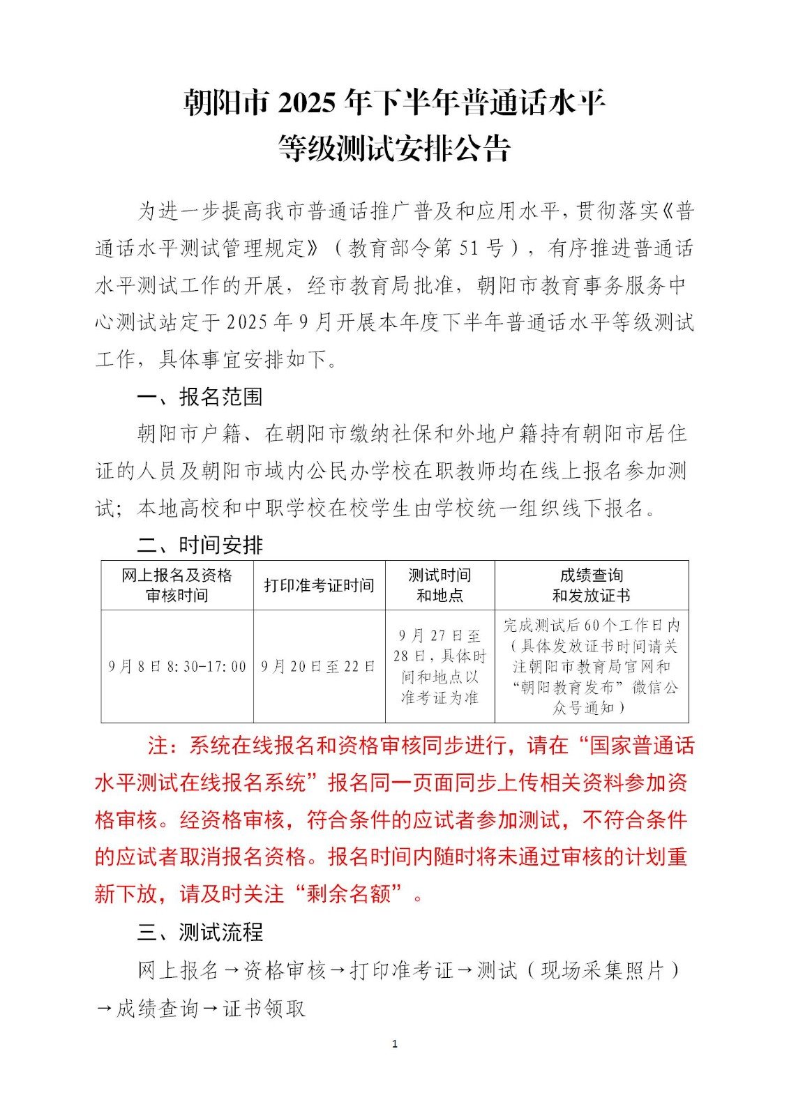 朝阳市2025年下半年普通话水平等级测试安排公告