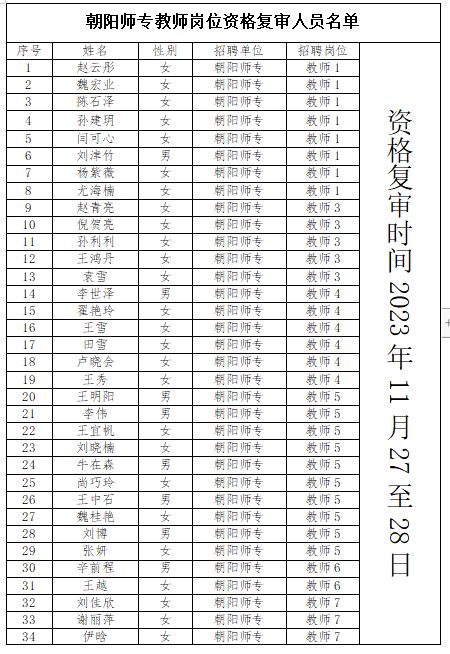 朝阳师范高等专科学校2023年公开招聘工作人员,报考教师岗位通过报名审核的考生全部进入资格审查环节。
