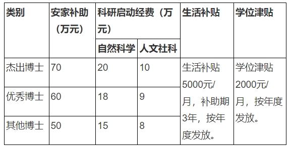 1.补贴政策。对引进的博士给予安家补助、科研启动经费、生活补贴、学位津贴等方面支持。安家补助分3年发放,每年发放三分之一。