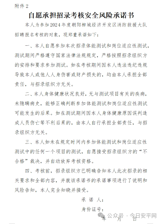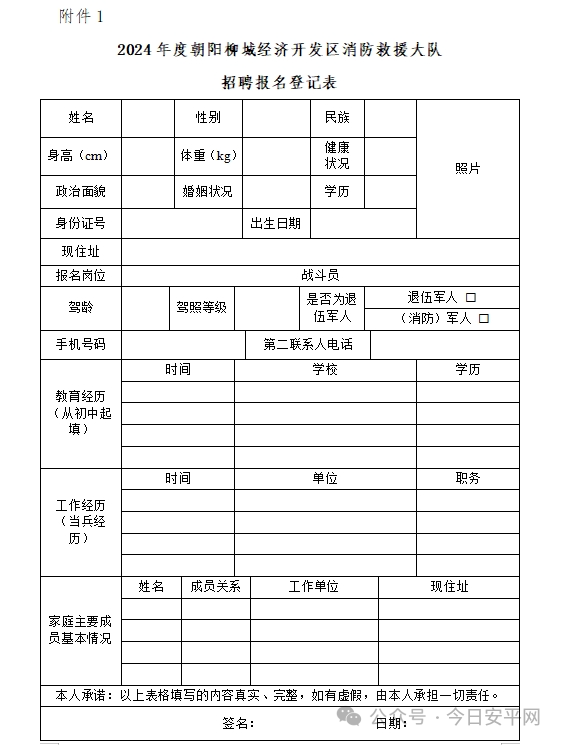 (7)《2024年度朝阳柳城经济开发区消防救援大队招聘报名登记表》(附件1),需本人手填或电脑打印真实详细信息。本人签名必须在报名现场手填,同时须粘贴近期、同一底版、彩色正面免冠照片;
