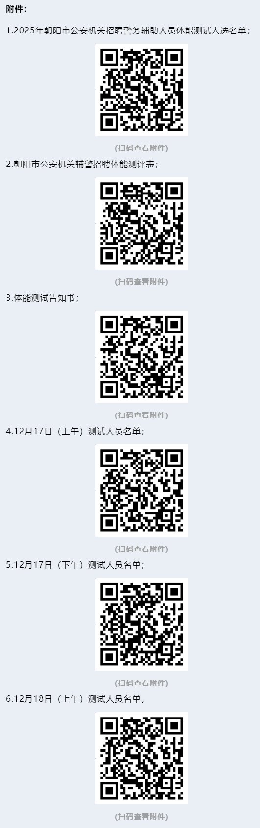 2025年朝阳市公安局面向社会公开招聘警务辅助人员笔试成绩达到合格分数线,依照笔试成绩由高到低的顺序,按照招聘计划的比例要求确定体能测试人选(具体人员名单见附件1)。