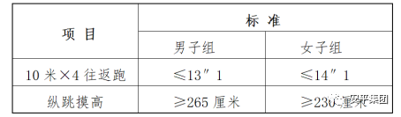 测试方法为:准备测试阶段,受测者双脚自然分开,呈站立姿势。接到指令后,受测者屈腿半蹲,双臂尽力后摆,然后向前上方快速摆臂,双腿同时发力,尽力垂直向上起跳,同时单手举起触摸固定的高度线或高度标识,触摸到高度线或者高度标识的视为合格。测试不超过三次。