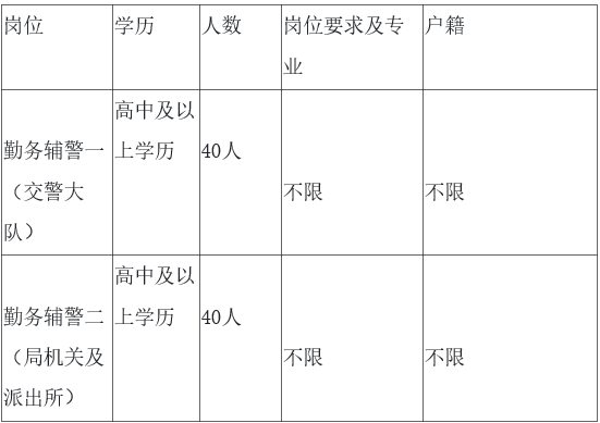计划招考勤务辅警80名仅限男性(因全部为外勤辅助人员,须长期执勤,不适合女性),主要从事警务辅助工作,职位信息如下: