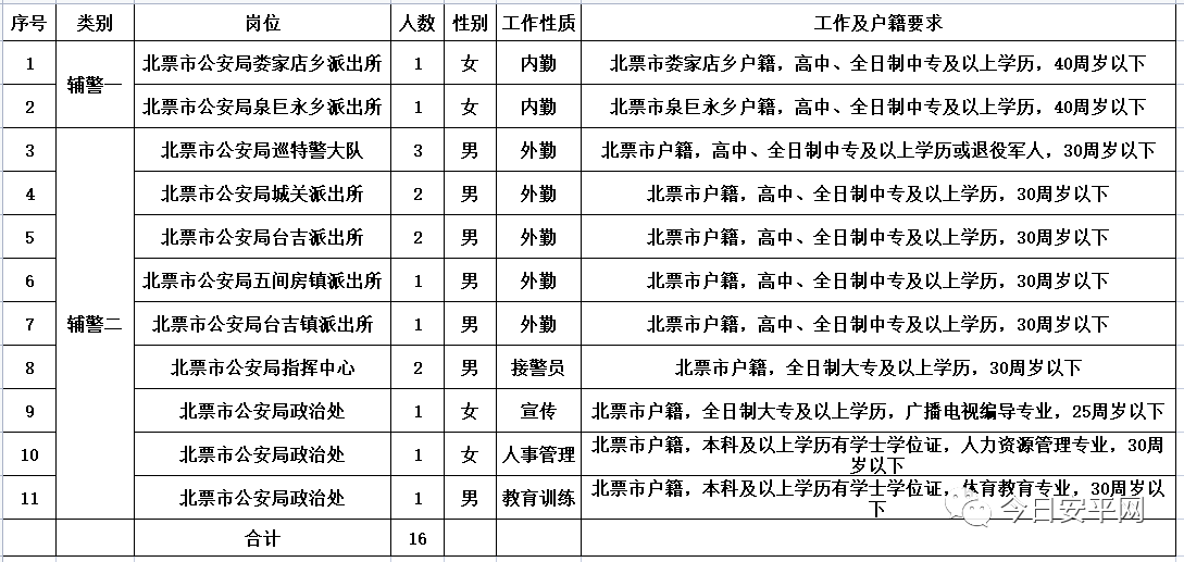 1、计划招聘16人,主要从事警务辅助工作,具体工作地点及要求如下:
