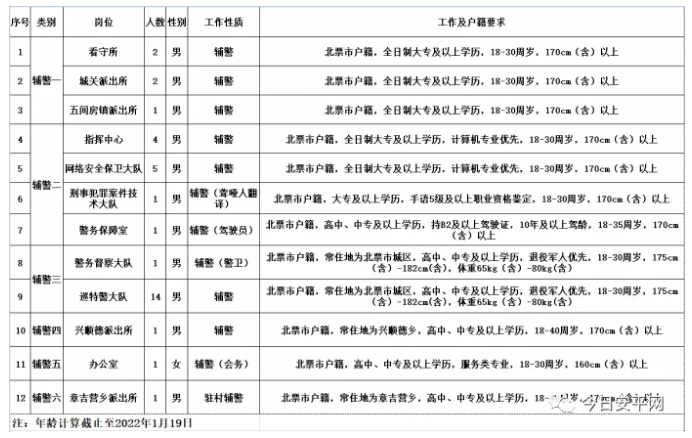 1、计划招聘34人,主要从事警务辅助工作,具体工作地点及要求如下:
