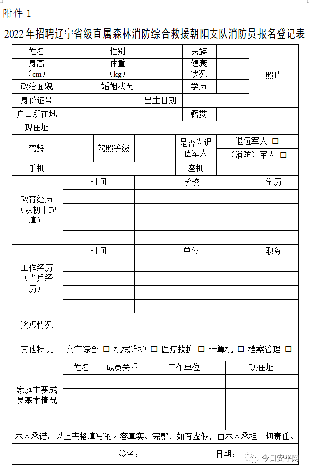 (6)《2022年度招聘省级森林消防综合救援队伍朝阳支队消防员报名登记表》(附件1),并需本人手填或电脑打印真实详细信息。本人签名必须本人手填,同时须粘贴近期、同一底版、2寸彩色正面免冠照片;