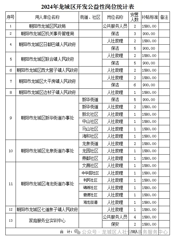 为进一步加大龙城区就业帮扶工作力度,切实解决就业困难人员就业问题,经龙城区人民政府批准,结合龙城区实际,决定公开招聘公益性岗位人员58名,现公告如下: