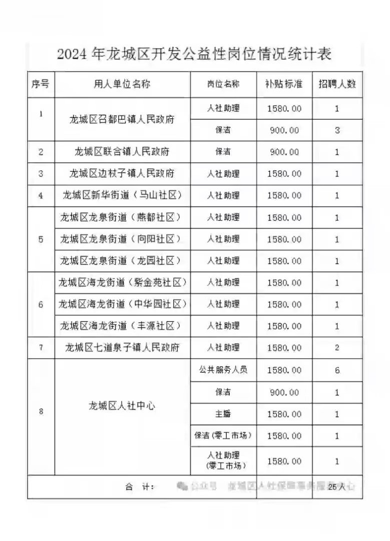 为进一步加大龙城区就业工作力度,切实解决就业困难人员就业问题,经龙城区人民政府批准,结合龙城区实际,决定公开招聘公益性岗位人员25名,现公告如下: