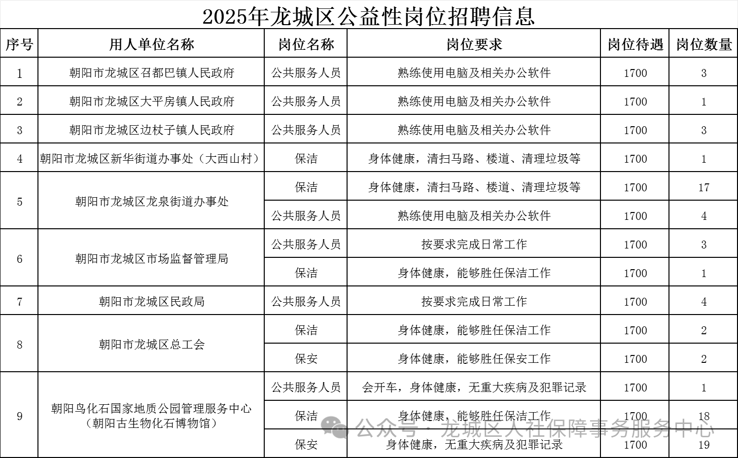 龙城区公益性岗位报名: 0421-3721009(411室)