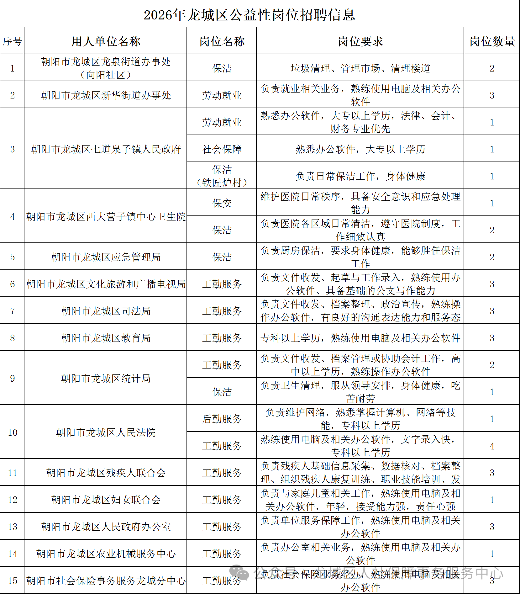 龙城区公益性岗位报名:0421-3721009(411室)