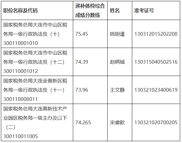 因部分职位考生放弃体检,根据公务员录用工作有关规定,对相关职位,按照综合成绩从高分到低分顺序确定递补体检人员。递补体检人员名单如下: