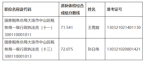 因部分职位考生放弃体检,根据公务员录用工作有关规定,对相关职位,按照综合成绩从高分到低分顺序确定递补体检人员。递补体检人员名单如下: