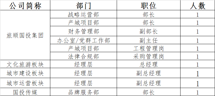 为吸引全社会优秀人才,结合公司发展实际,本次面向旅顺国投集团员工和社会进行公开选聘。