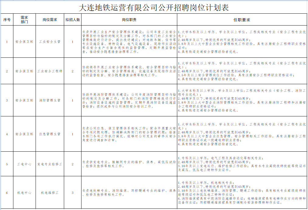 大连地铁运营有限公司安全管理岗位和专业技能岗位,详见《地铁运营公开招聘岗位计划表》(附件1)。