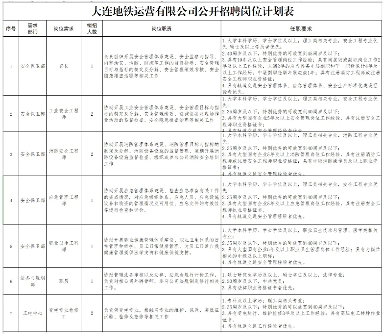 大连地铁运营有限公司安全管理岗位和专业技能岗位,详见《地铁运营公开招聘岗位计划表》(附件1)。
