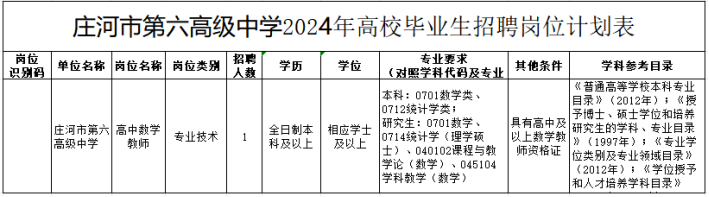 附件1:庄河市第六高级中学2024教师招聘信息表