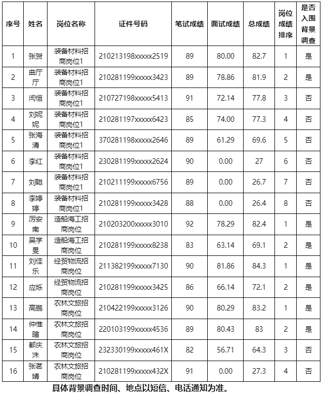 大连长兴岛综合服务有限公司招商雇员 外聘成绩及入围背景调查情况公告 根据《大连长兴岛综合服务有限公司招商雇员招聘公告》,现将成绩及入围背景调查情况公告如下: