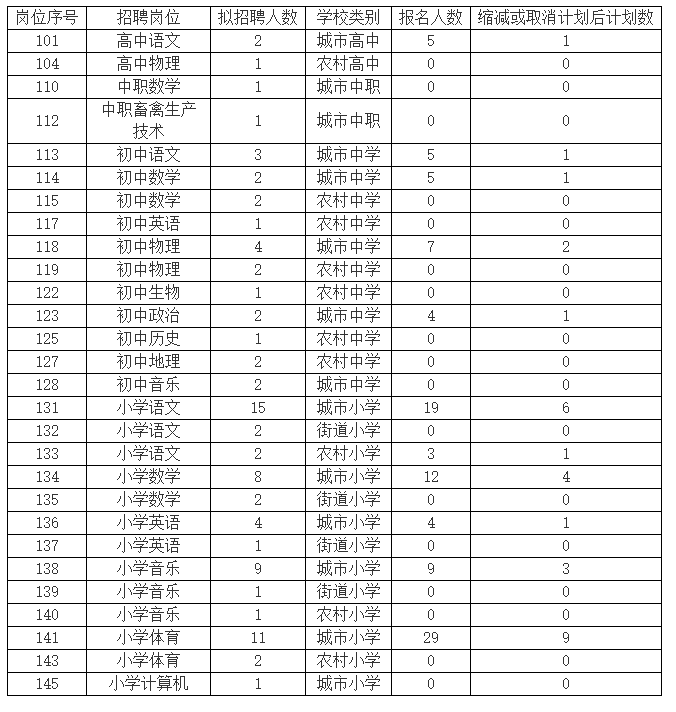 根据《庄河市教育系统2024年自主招聘优秀毕业生公告》规定,报名工作已结束,现将计划缩减或取消情况公告如下: