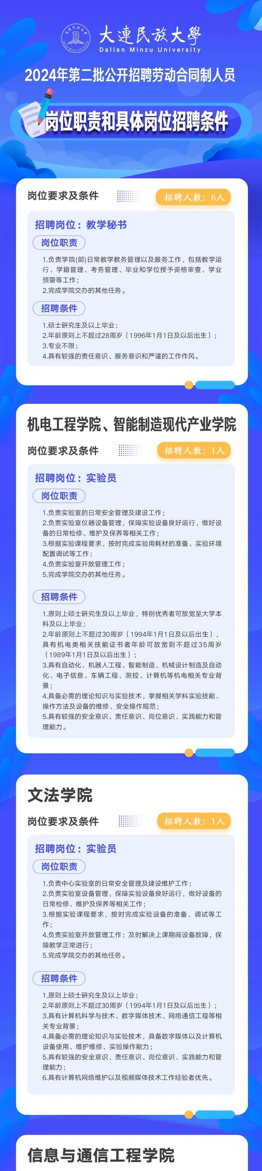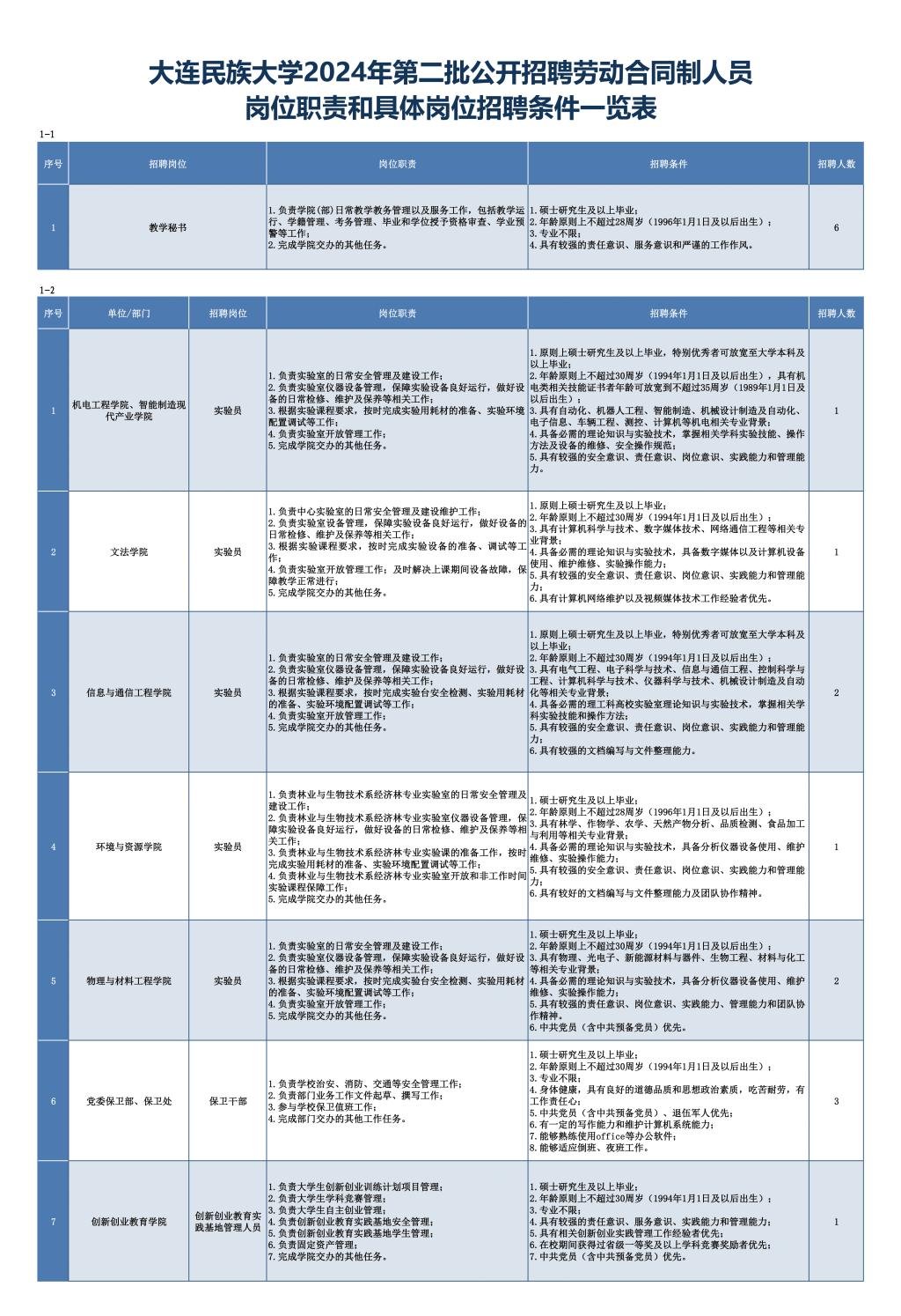 详见《大连民族大学2024年第二批招聘劳动合同制人员岗位职责和具体岗位招聘条件一览表》(见下图)。