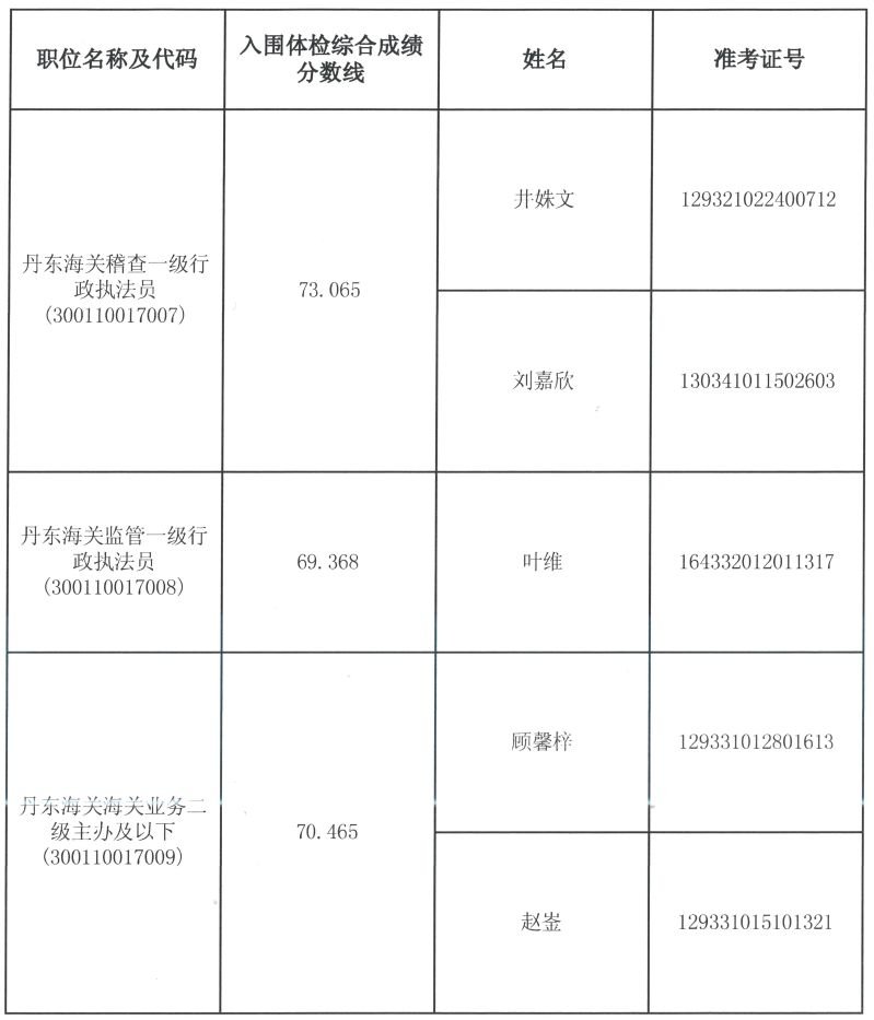 根据公务员录用工作有关规定,按照综合成绩从高到低的顺序,以下考生入围体检: