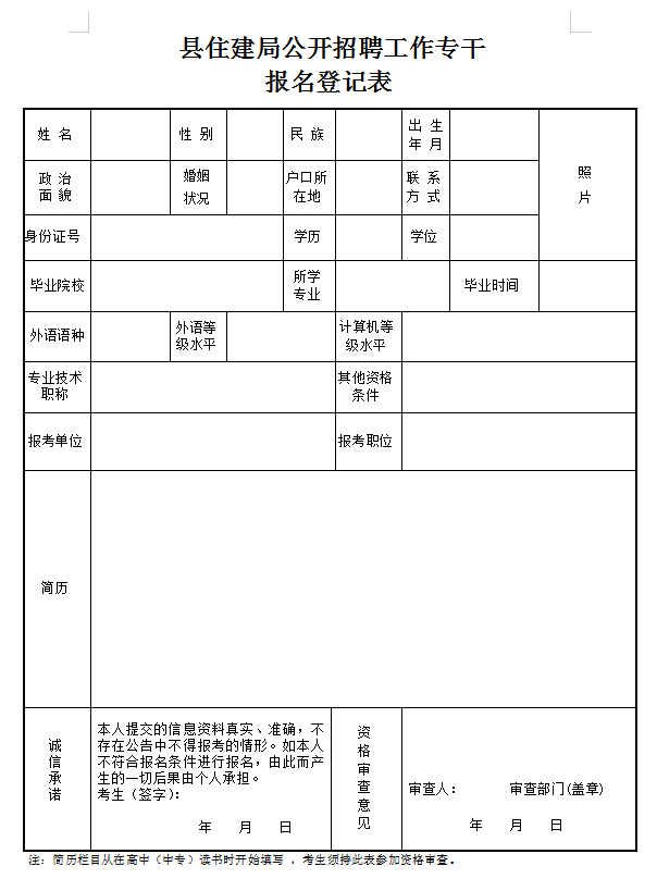 (1)填报《县住建局公开招聘专干报名登记表》一份,近期免冠2寸彩色照片1张;