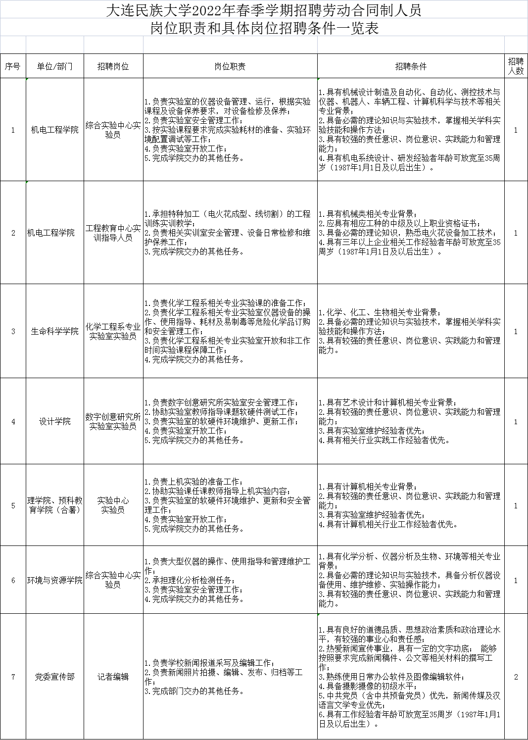 1.大连民族大学2022年春季学期招聘劳动合同制人员岗位职责和具体岗位招聘条件一览表