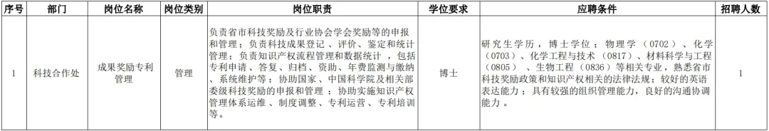 中国科学院大连化学物理研究所本着“按需设岗、公开招聘、竞争上岗、择优聘用”的原则,根据《大连化物所事业编制工作人员招聘实施细则(试行)》有关要求,现面向社会公开招聘职能部门工作人员1名,具体信息如下:
