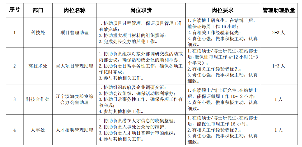为做好职能部门后备人才储备,提高我所培养研究生和博士后综合能力,现面向我所在读研究生(硕士/博士)、在站博士后开展职能部门管理助理招聘工作,具体信息如下: