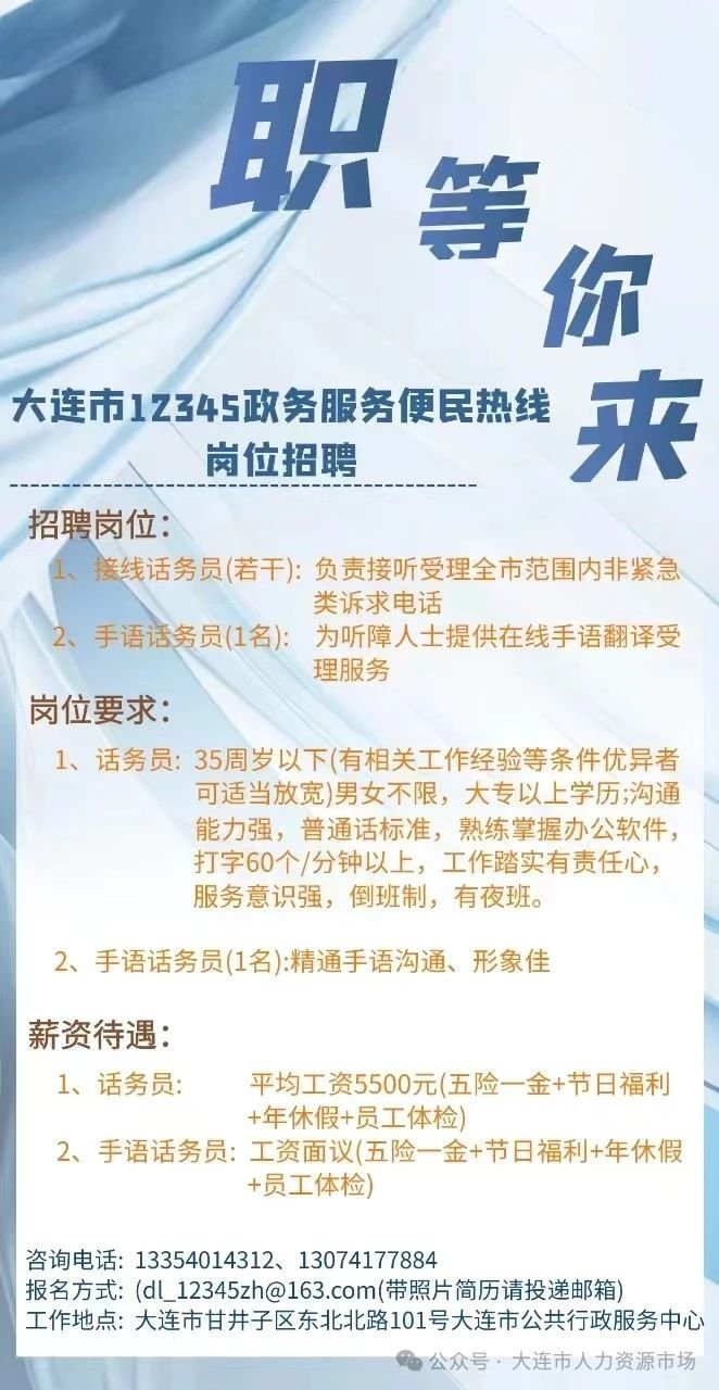 工作地点:大连市甘井子区东北北路101号大连市公共行政服务中心