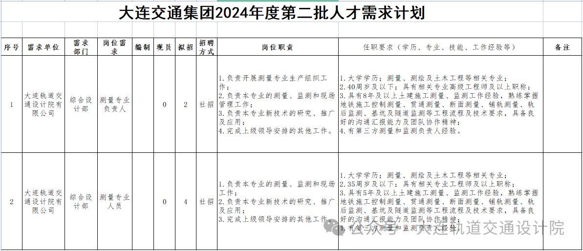 详见《大连轨道交通设计院有限公司2024年第二批人才公开招聘岗位计划表》(附件1)。