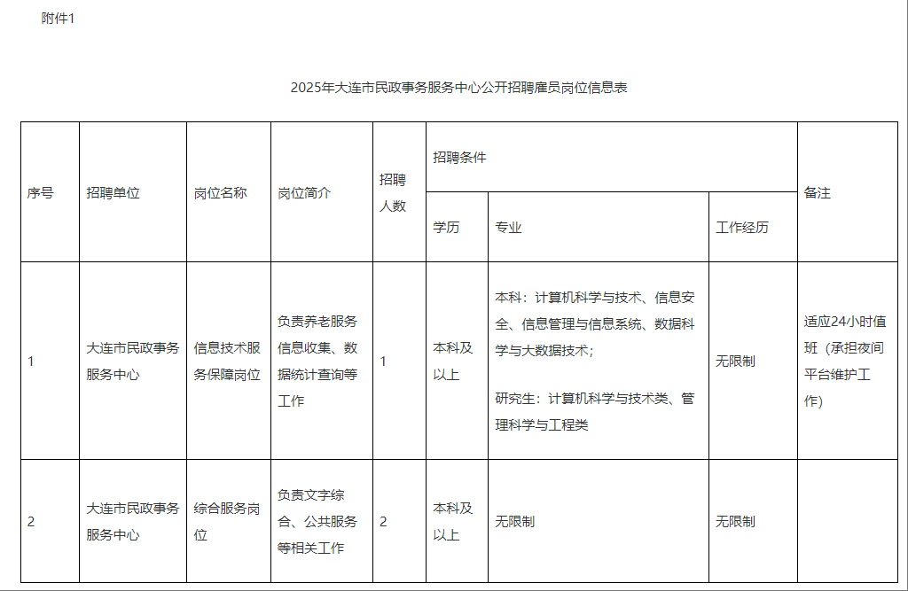 具体岗位及人数详见《2025年大连市民政事务服务中心公开招聘雇员岗位信息表》(附件1)。