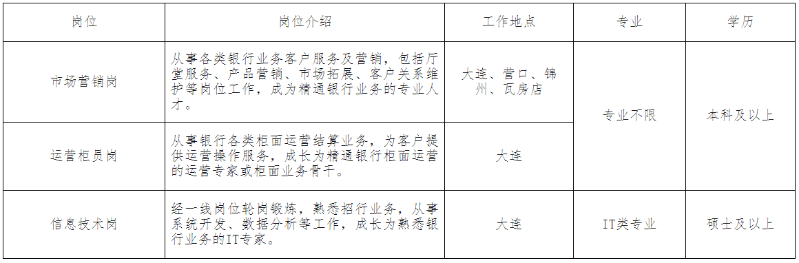 招商银行大连分行成立于1997年5月8日,是招商银行在辽的一级分行。截至2025年8月,招商银行大连分行全辖营业网点34家,下辖锦州、营口两家二级分行,员工人数逾1180人。大连分行坚持价值银行战略,深入践行金融工作的政治性、人民性,致力于为客户、员工、股东、合作伙伴及社会创造更大的综合价值,得到来自政府、监管、社会各界的多方认可。获评本地权威媒体“金五星”影响力、创新力金融机构等奖项;连续两年荣获智联招聘“中国年度优选雇主”称号;荣获辽宁省“金融兴辽”科技金融优秀案例、大连市首届服务地方经济高质量发展十佳典型案例等荣誉。招商银行大连分行致力于打造“最佳员工成长银行”,力求为员工提供完善的培训体系、公平的竞争机制、广阔的职业平台,持续提升员工体验和幸福感。为助力大连分行高质量发展,现面向境内外高校招聘普通高等院校毕业生,具体如下: