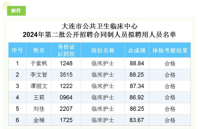 根据《2024年大连市公共卫生临床中心第二批公开招聘合同制工作人员公告》,经过报名、资格审查、笔试或实操考核、面试、体检和考察等程序,现将2024年大连市公共卫生临床中心第二批公开招聘合同制人员拟聘用人员名单进行公示,公示期从2024年5月23日至5月31日,共7个工作日。