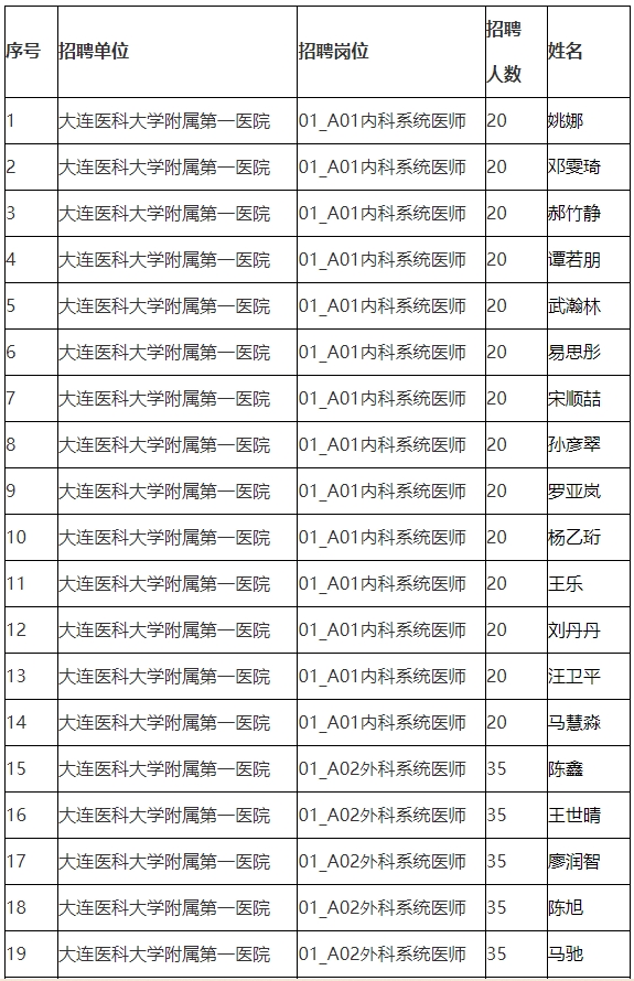 经报名、资格审查、考核,大连医科大学附属第一医院2024年公开招聘高层次人才第一批体检人员已确定,现将名单公布如下: