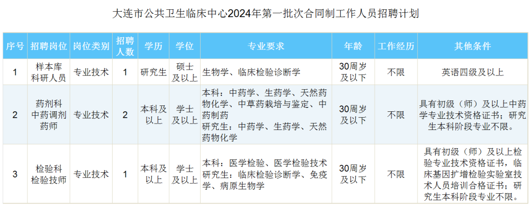 此次共招聘合同制人员4人,所有岗位均为大连市公共卫生临床中心合同制,具体招聘岗位、人数、条件等详见附件1。