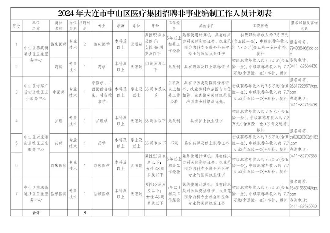(五)具有岗位所需要的专业技能和其他条件。参照《2024年大连市中山区医疗集团招聘非事业编制工作人员计划》;