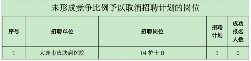 2024年大连市皮肤病医院公开招聘报名和资格初审工作已结束,按照《2024年大连市皮肤病医院公开招聘公告》规定,现对未形成竞争比例的岗位予以取消,具体公告如下:
